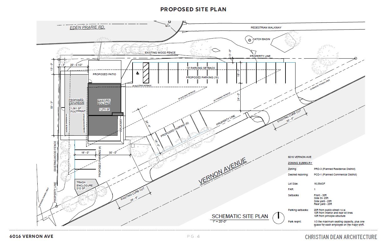 Request has been fabricated past Special Ten Properties LLC for a Sketch Plan Review of a proposal to remodel and expand the existing machine repair shop at 6016 Vernon Avenue into a 68-seat eating place and i,060 square pes office building. The structure addition would be two stories alpine. The existing site is zoned PCD-4, Planned Commercial Commune, which allows only machine service centers, gas stations and car washes. Restaurants and offices are allowed uses in the PCD-1, Planned Commercial Zoning District, therefore, if a formal application is fabricated for this proposal it would require a Rezoning from PCD-4, Planned Commercial District 4 to PCD-1, Planned Commercial District 1. Additionally, the post-obit setbacks would exist required: 1) Front Setback Variance for the building improver to Eden Prairie Road from 35 to 13 feet; 2) Front Setback Variance for the patio located toward Eden Prairie Road from 35 feet to ane-foot; 3) Side Chiliad setback variance for the building add-on from 25 to v anxiety; and 4) a Parking Stall Variance from 33 stalls to 26. This request would require a Comprehensive Plan Amendment from Medium Density Residential to Neighborhood Node.